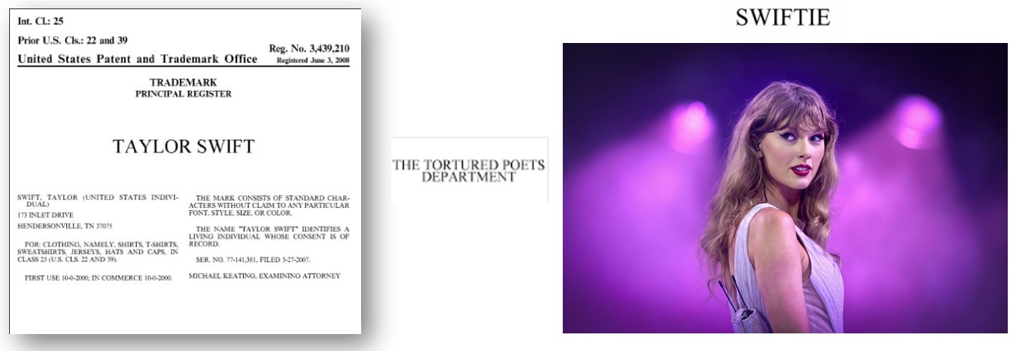 Taylor Swift has about 50 trademarks and owns over 200 federal trademark registrations for them since the year 2007. Her trademarks range from her name, initials, signature, names of her albums, fan club, song titles, lyrics, concerts and music festival.